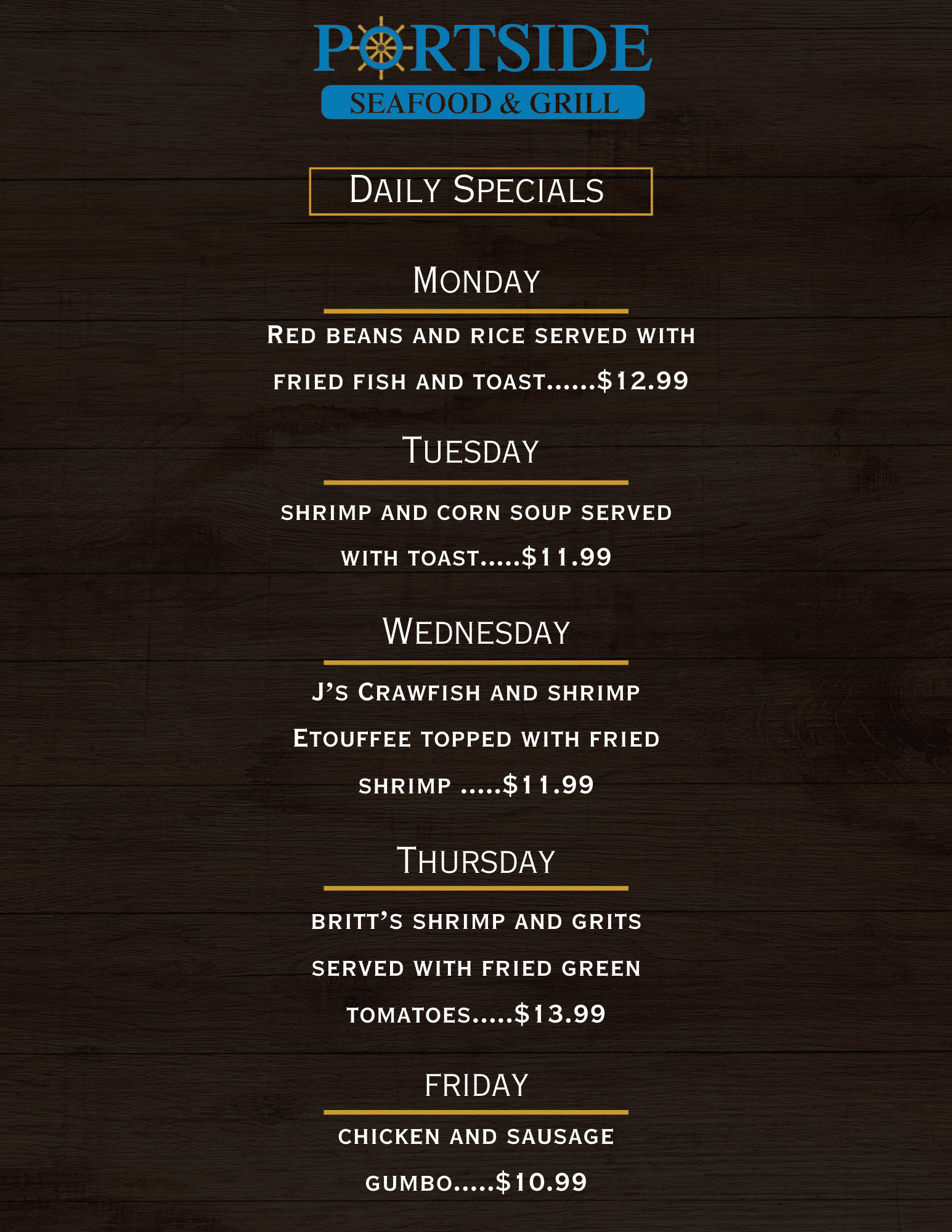 Portside Seafood & Grill serves the best Seafood in Hammond, LA. We offer daily specials and enough seafood to keep you coming back for more.